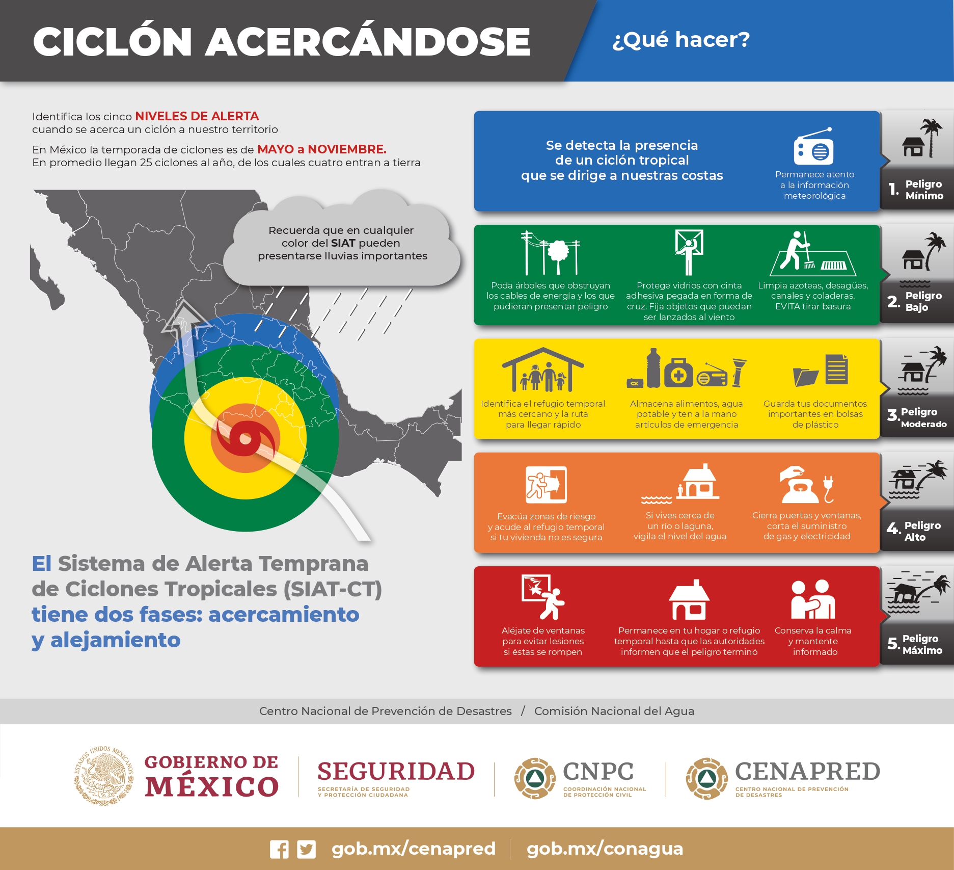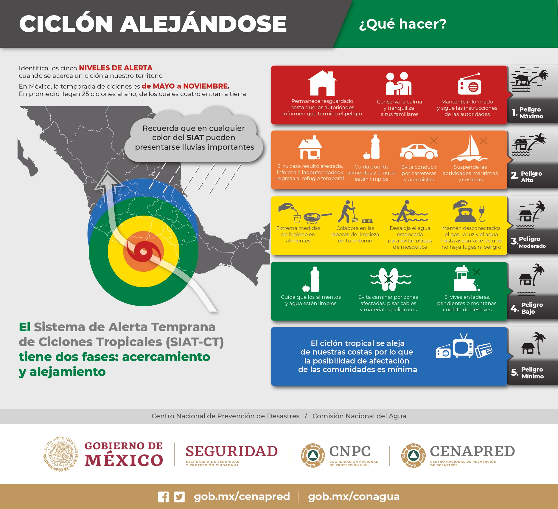 - UNIDADES ESTATALES DE PROTECCIÓN CIVIL – Atender la evolución de este ciclón tropical, notificar a integrantes del SINAPROC en ámbitos estatales y municipales, así como considerar las siguientes recomendaciones de acuerdo al nivel de alerta del Sistema de Alerta Temprana para Ciclones Tropicales (SIAT-CT):