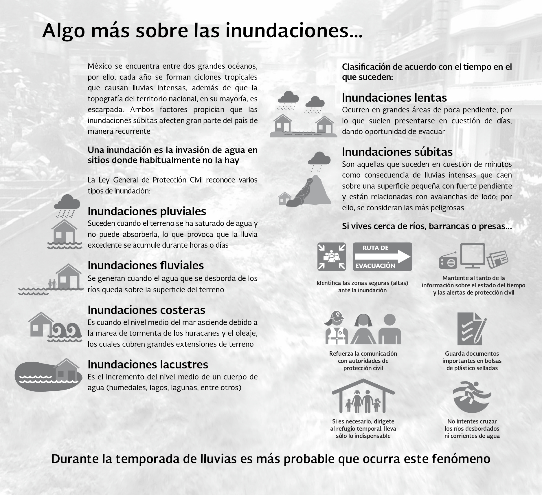 - Extremar precauciones al tránsito vehicular en carreteras y caminos rurales, vados y puentes serranos, así como zonas urbanas, si es necesario buscar rutas alternas.