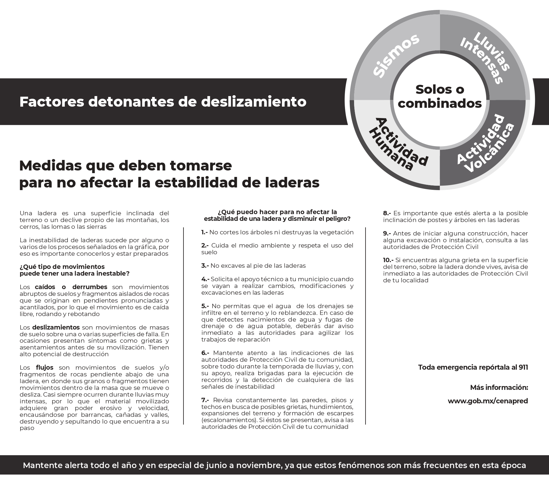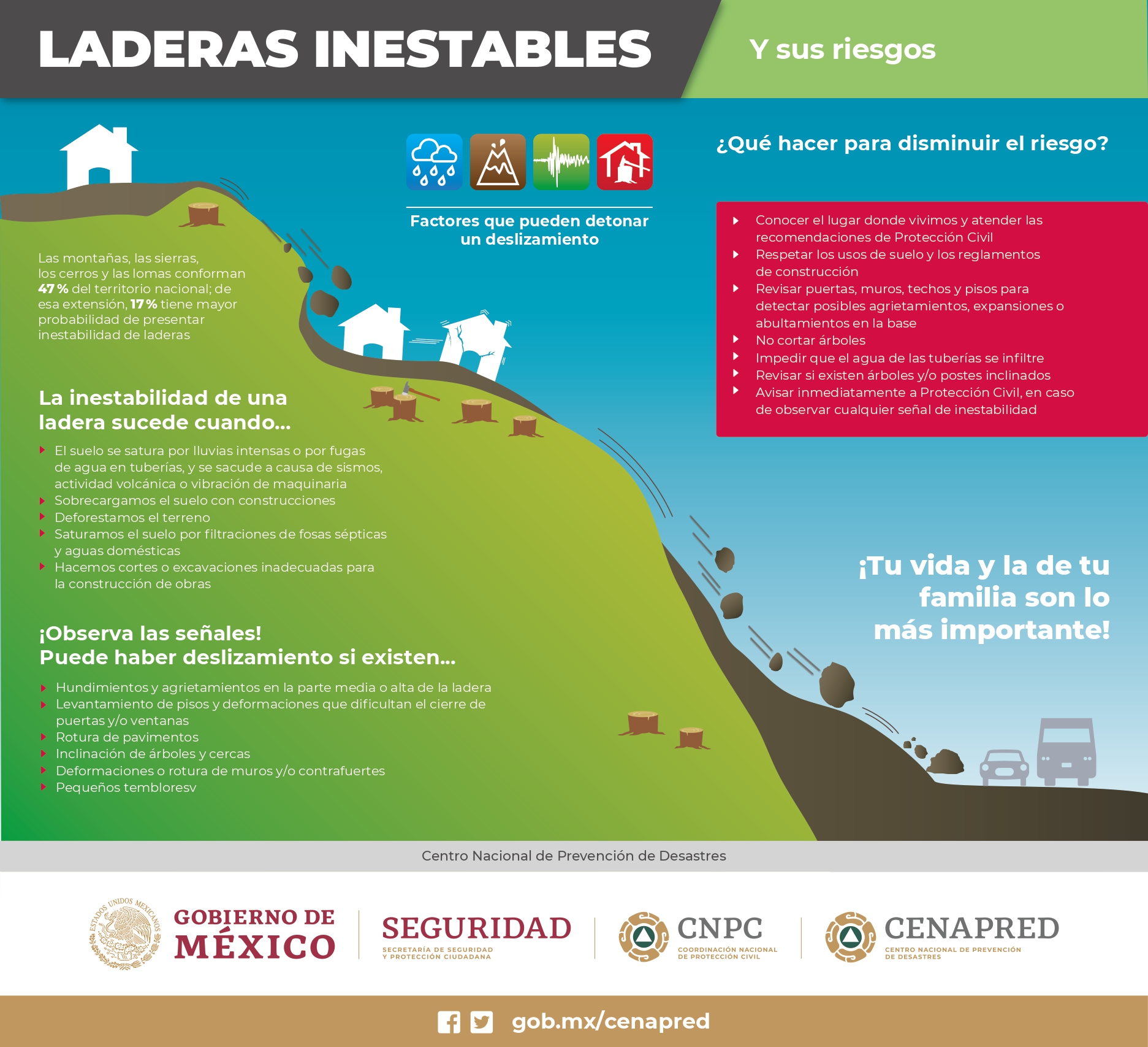 - Cuide que no haya descargas o fugas de agua en las casas ubicadas sobre laderas, para evitar la infiltración del subsuelo.